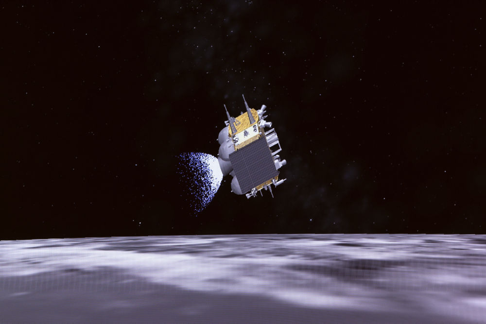 6月4日在北京航天飛行控制中心屏幕上拍攝的等待點(diǎn)火起飛的嫦娥六號(hào)著陸器和上升器(動(dòng)畫(huà)模擬畫(huà)面)。畫(huà)面中,五星紅旗在月球背面展開(kāi)。