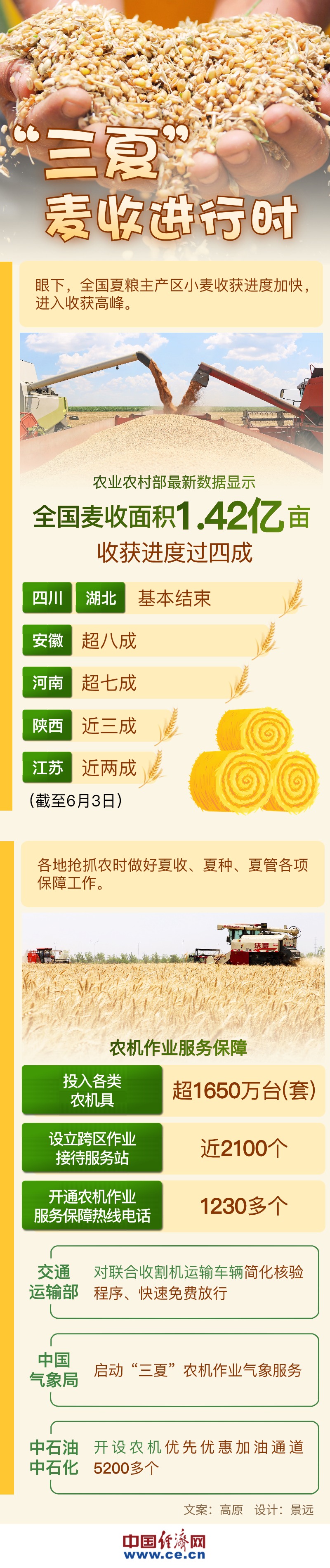 目前,麥收省份已設立跨區(qū)作業(yè)接待服務站近2100個,開通農(nóng)機作業(yè)服務保障熱線電話1230多個;交通運輸部印發(fā)通知,對聯(lián)合收割機運輸車輛進一步簡化核驗程序、快速免費放行;中國氣象局啟動“三夏”農(nóng)機作業(yè)氣象服務,助力打好機收大會戰(zhàn)。各地中石油、中石化等開設農(nóng)機優(yōu)先優(yōu)惠加油通道5200多個,組織開展“送油到田”服務,全力保障作業(yè)用油供給。