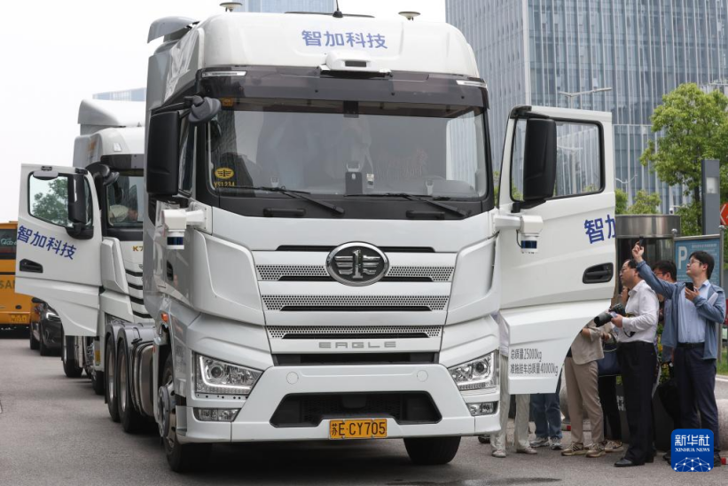 6月1日,人們在參觀兩輛由蘇州智加科技有限公司與車企共同開發(fā)的智能駕駛重型卡車。新華社記者 楊磊 攝