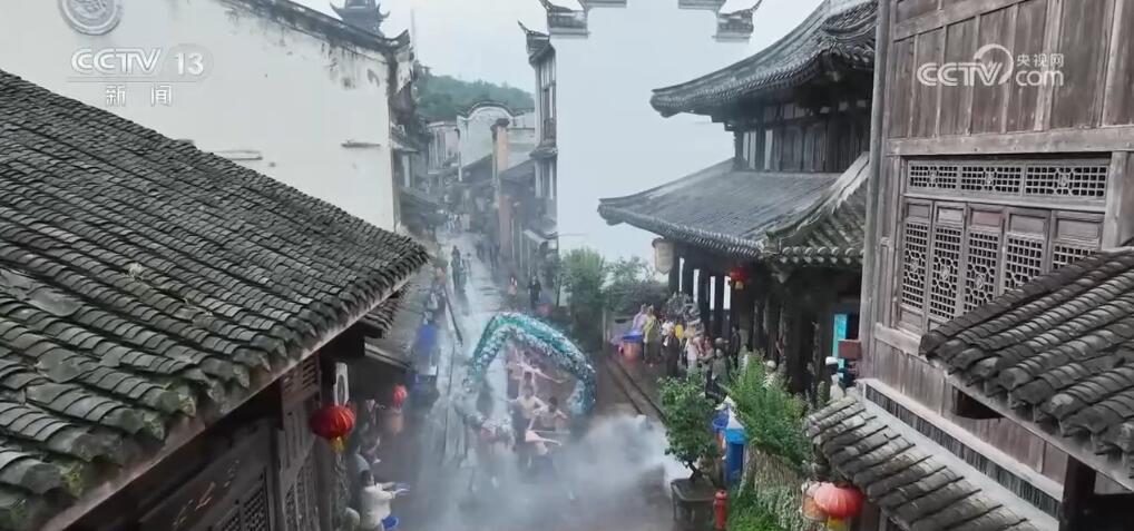 重慶市銅梁區(qū)的安居古城正在進(jìn)行端午節(jié)的非遺文化表演——水云龍。10名赤膊的漢子舞動(dòng)著一條18米的藍(lán)色水云龍,整條龍上下翻騰、左右騰挪,在兩邊明清時(shí)期的老屋之間穿行。而站在兩旁的居民和游客會拿著水瓢或者水盆,將清水潑向正在舞動(dòng)的水云龍。雖然水云龍所到之處,大家衣衫都可能打濕,但是大家都樂在其中。