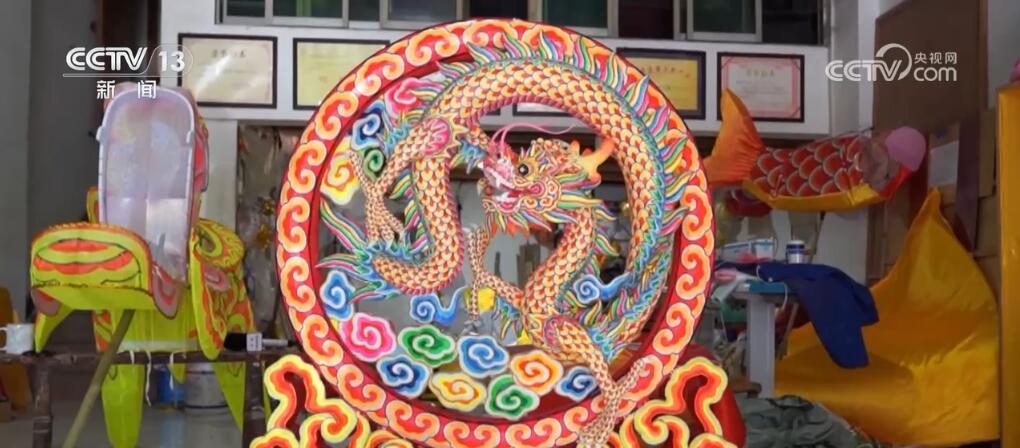 這件精美的龍燈彩扎藝術(shù)品,名叫《飛龍?jiān)谔臁罚怯煞沁z傳承人周合平歷時(shí)3個(gè)月完成的,馬上就要送往北京,收藏在中國非物質(zhì)文化遺產(chǎn)館。在這間扎龍工作室里,記者看到,大家正在趕制一批表演用的龍燈。