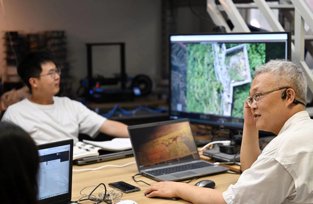 天津大學建筑學院教授李哲(右)和學生在工作室內就拍攝的長城圖像進行交流。新華社記者李然 攝