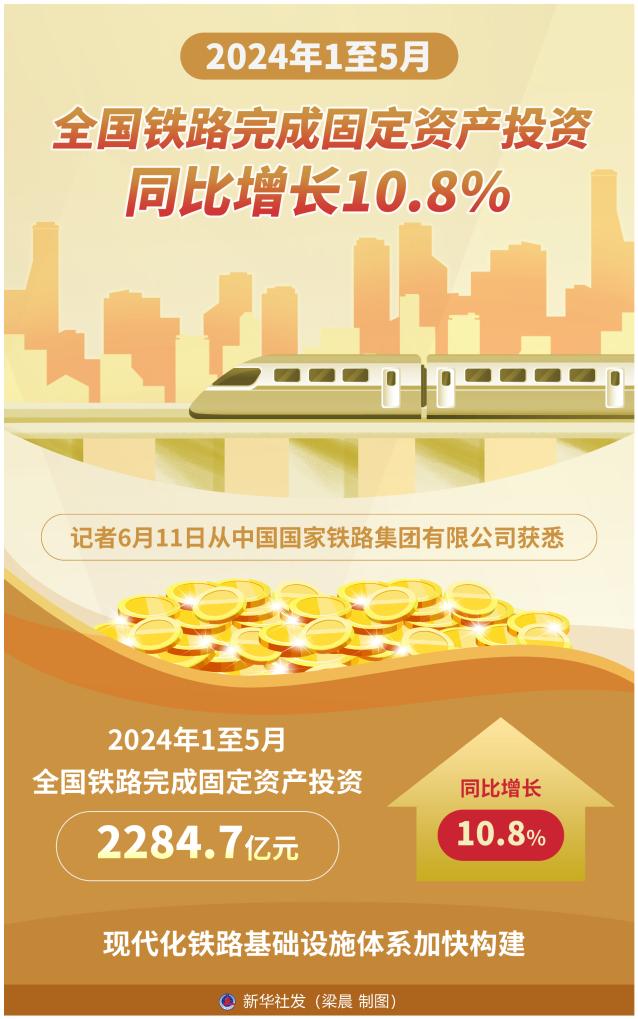 新華社北京6月11日電(記者樊曦、韓佳諾)記者11日從中國國家鐵路集團有限公司獲悉,今年1至5月,全國鐵路完成固定資產(chǎn)投資2284.7億元,同比增長10.8%,現(xiàn)代化鐵路基礎(chǔ)設(shè)施體系加快構(gòu)建。