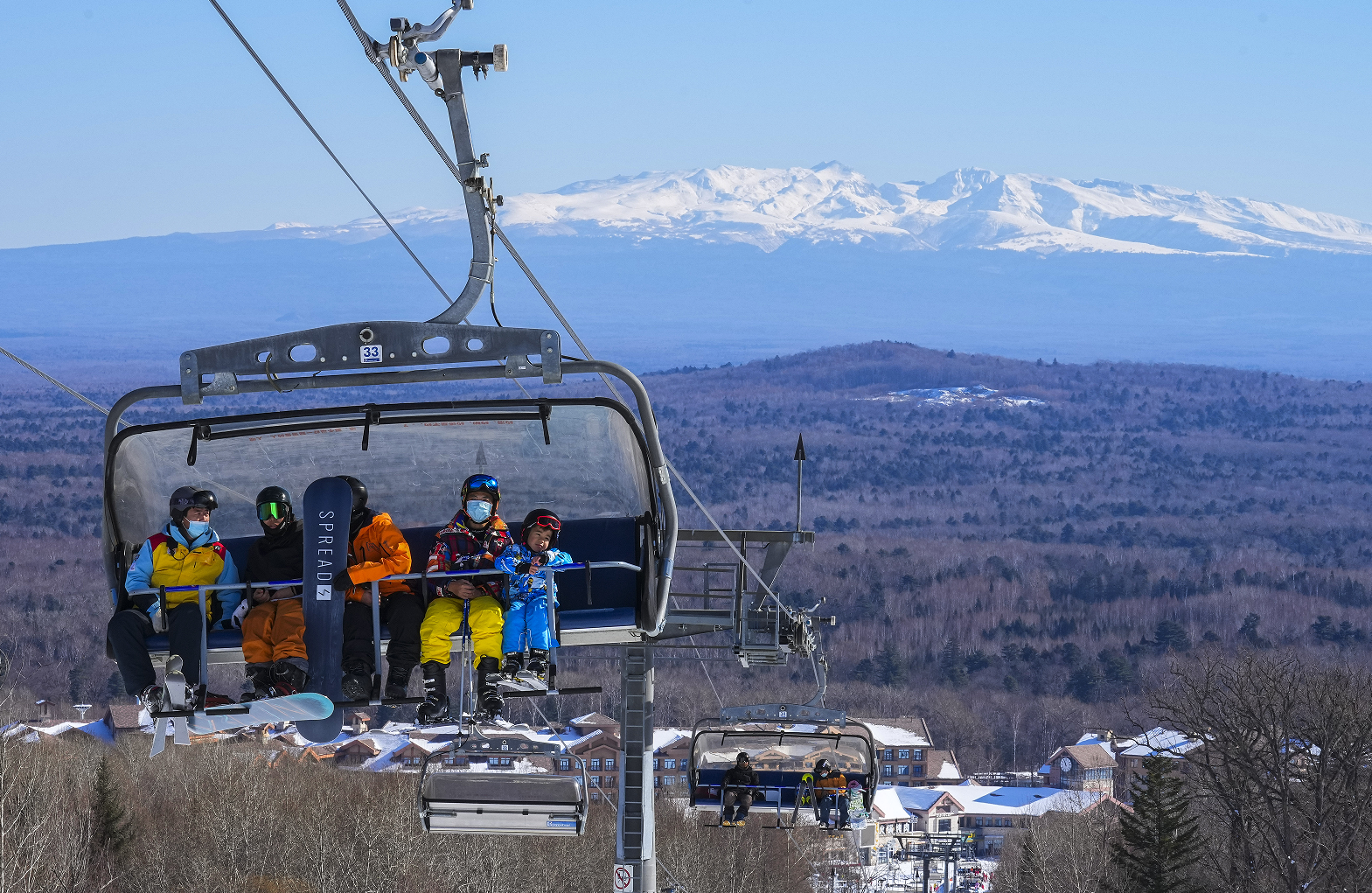 長白山西坡的萬達(dá)滑雪度假區(qū)內(nèi),雪友乘坐纜車上山。 記者 許暢 攝