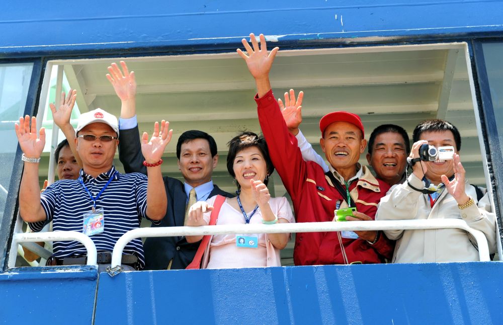 2009年5月15日,350名臺(tái)胞乘坐“海洋拉拉號(hào)”客輪從臺(tái)中港直航福建湄洲島謁祖進(jìn)香,拉開了首屆“海峽論壇”活動(dòng)的序幕。新華社記者 張國俊 攝