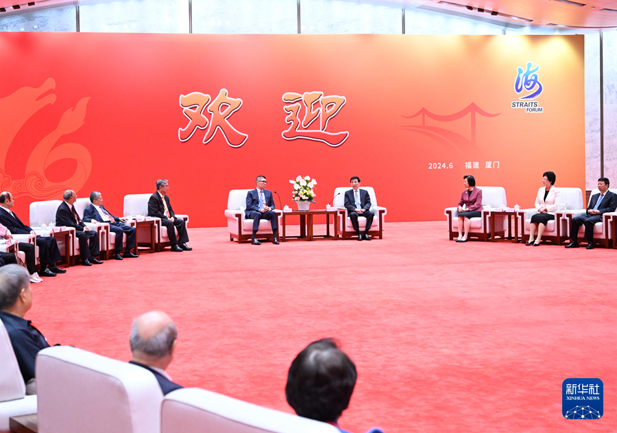 6月15日,第十六屆海峽論壇大會在廈門舉行。中共中央政治局常委、全國政協主席王滬寧出席并致辭。這是大會開始前,王滬寧會見參加論壇的臺灣嘉賓代表。新華社記者 申宏 攝