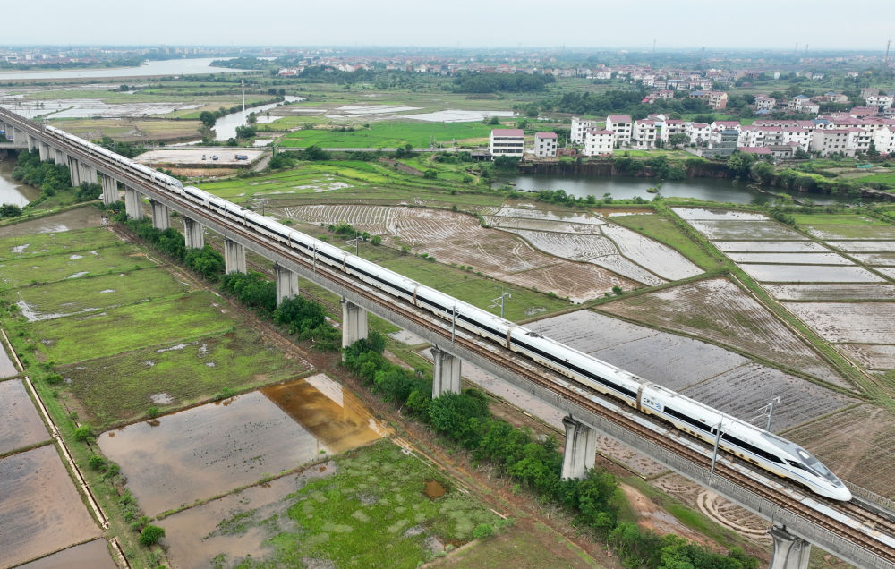 一輛高鐵列車從位于江西省鷹潭市的田野間駛過(guò)(無(wú)人機(jī)照片,6月4日攝)。新華社記者 萬(wàn)象 攝