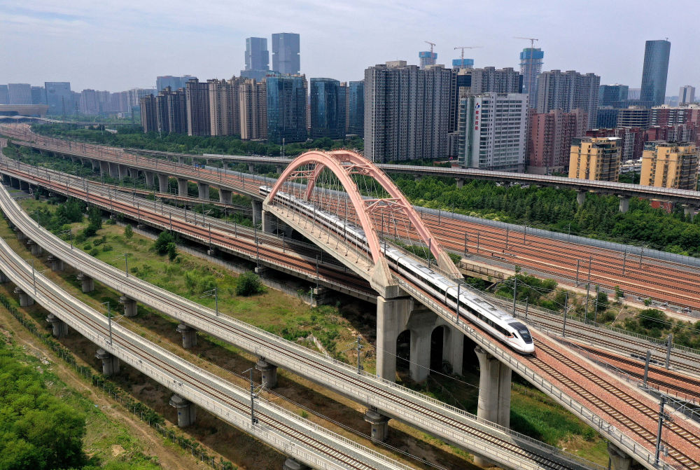 一列動(dòng)車組列車行駛在鄭州東站附近的線路上(5月30日攝)。新華社記者 李安 攝