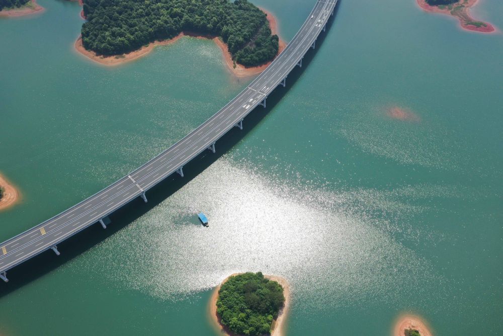 這是位于江西省九江市永修縣與武寧縣交界處的廬山西海與跨過(guò)水面的永武高速公路(無(wú)人機(jī)照片,6月7日攝)。新華社記者 周密 攝