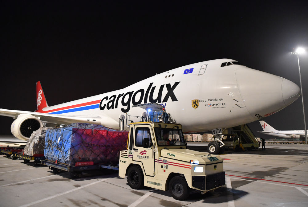 在鄭州新鄭國(guó)際機(jī)場(chǎng),工作人員駕駛新能源拖車為一架盧森堡貨航貨機(jī)卸貨(2023年8月1日攝)。新華社記者 李嘉南 攝