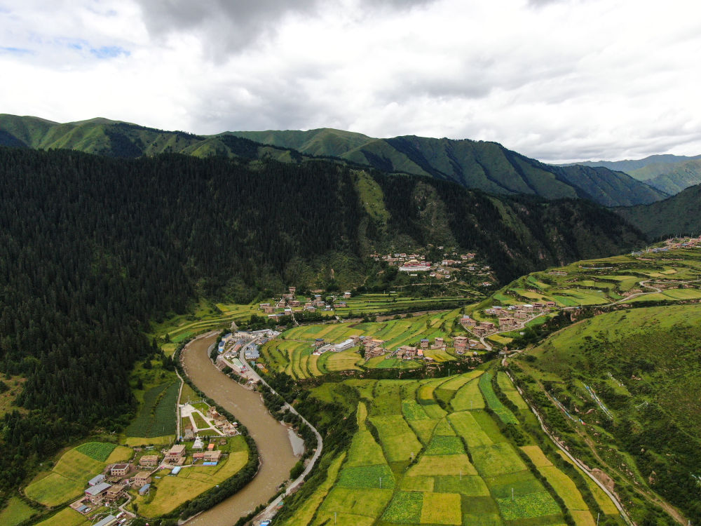 青海省果洛藏族自治州班瑪縣境內(nèi)拍攝的村莊景色(2021年8月7日攝,無(wú)人機(jī)照片)。