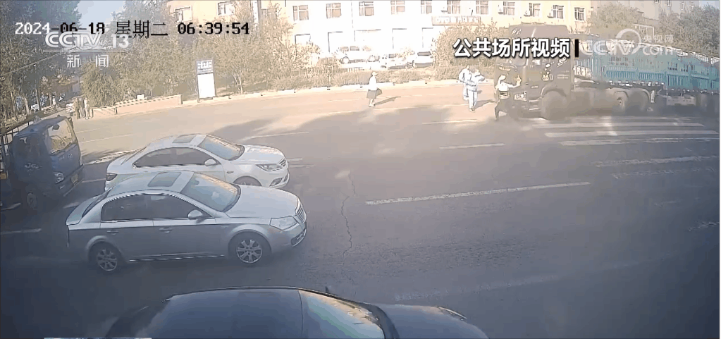 視頻顯示,6月18日早上6點40分左右,輔警陳作兵在長春市第一O六中學校門前執(zhí)勤。突然,一輛大貨車從遠處駛來,不斷鳴笛。眼看就要經過斑馬線卻沒有及時減速,此時學生和家長正要過馬路。陳作兵看到后,立即截停車輛,貨車剎車后由于慣性將他撞得連連后退。