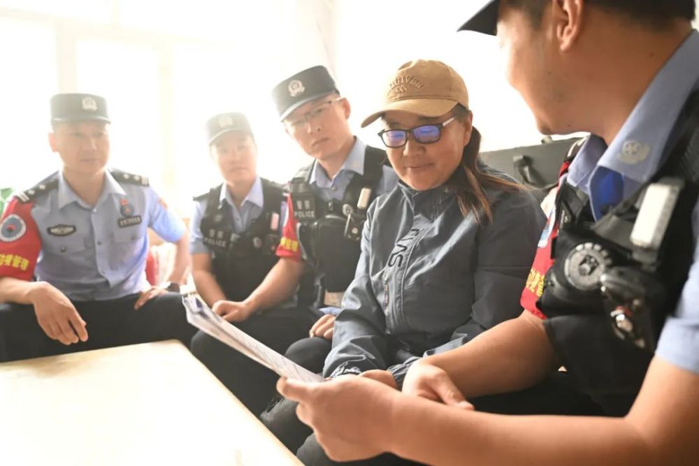 2024年6月22日,四子王旗邊境管理大隊民警在恩克其其格(右二)家宣講嫦娥六號返回注意事項。2003年10月16日,神舟五號飛船返回艙著陸在恩克其其格家的草場上。新華社記者 連振 攝