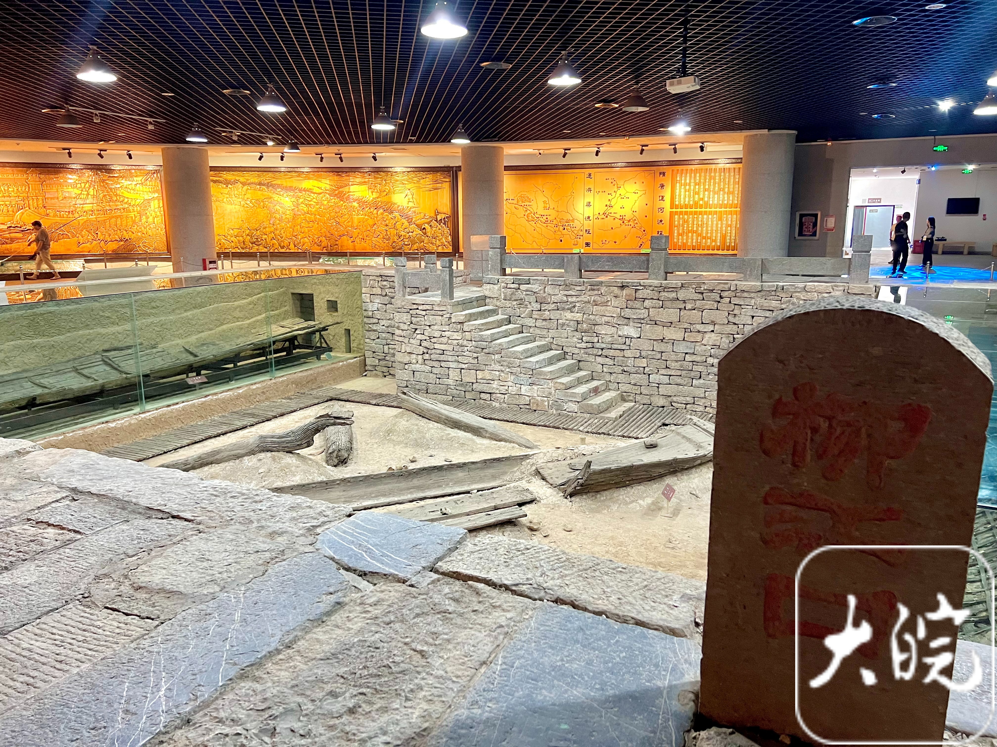 值得一提的是,館內還復原了柳孜運河遺址。現場不僅能看到千年前的柳江口碼頭,還能看到“淮北舵”唐代貨船和唐代獨木舟。零散的船板、傾斜的木樁、散落的瓷器,再現了發(fā)掘時的現場實景,給人身臨其境之感。