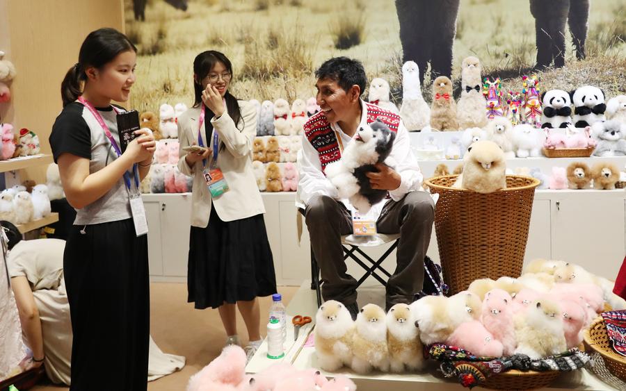 馬馬尼大叔在上海進博會“溫暖駝”品牌展臺內向一名參觀者展示剛制作完成的羊駝玩偶(2023年11月5日攝)。新華社記者 方喆 攝