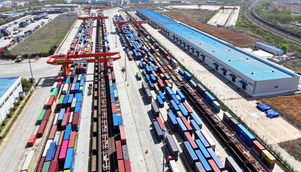 這是2024年4月15日拍攝的位于山東省青島市的上合示范區(qū)多式聯(lián)運(yùn)中心(無(wú)人機(jī)照片)。圖片來(lái)源:新華社
