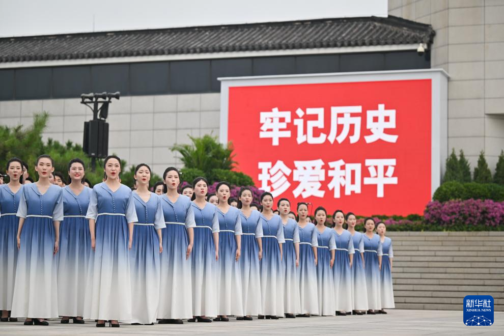 7月7日,首都大學(xué)生合唱團(tuán)在紀(jì)念全民族抗戰(zhàn)爆發(fā)87周年儀式上演唱。新華社記者 李響 攝