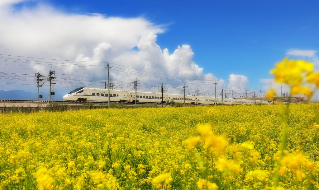 白色動(dòng)車在門源的草原上疾馳,遠(yuǎn)處的油菜花田里滿是泛黃的花苞。