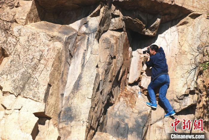 資料圖。圖為2018年,包金泉在科右中旗杜爾基鎮(zhèn)衙門毛杜嘎查境內(nèi),采集畢其格哈達(dá)題記內(nèi)容。 科右中旗文物考古研究所供圖