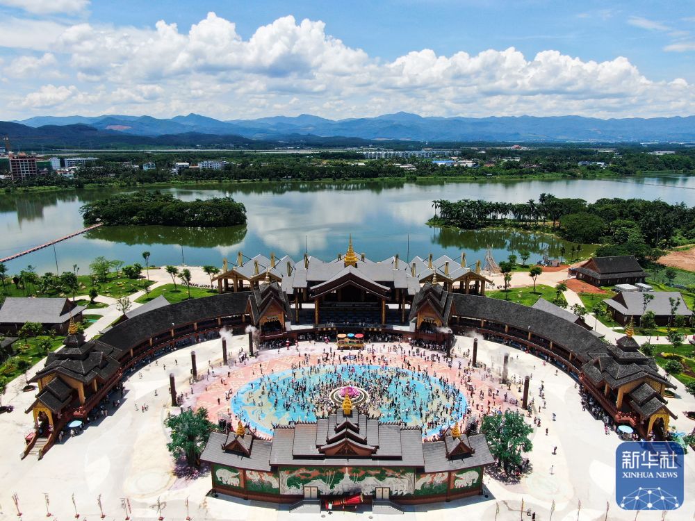 在云南省西雙版納傣族園景區(qū)內(nèi)的傳統(tǒng)傣寨曼聽(tīng)村,游客參加潑水狂歡活動(dòng)(無(wú)人機(jī)照片,7月7日攝)。新華社發(fā)(李云生 攝)