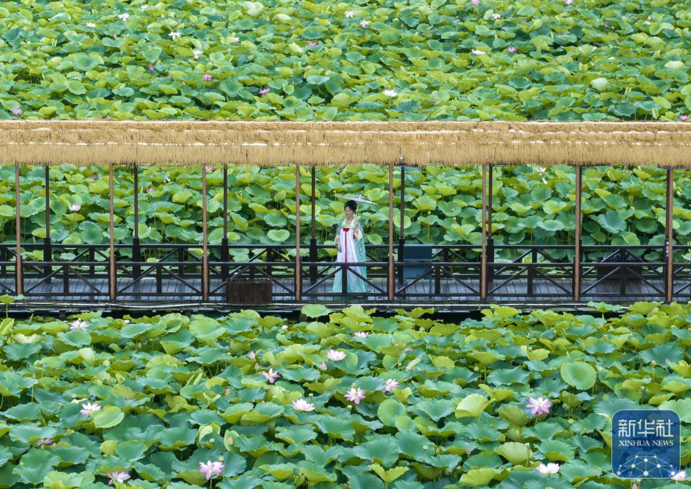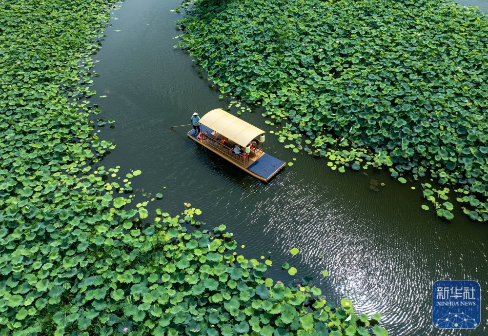7月8日,游客在江蘇省興化市千垛鎮(zhèn)的萬(wàn)畝荷塘景區(qū)賞荷游玩(無(wú)人機(jī)照片)。新華社發(fā)(周社根 攝)
