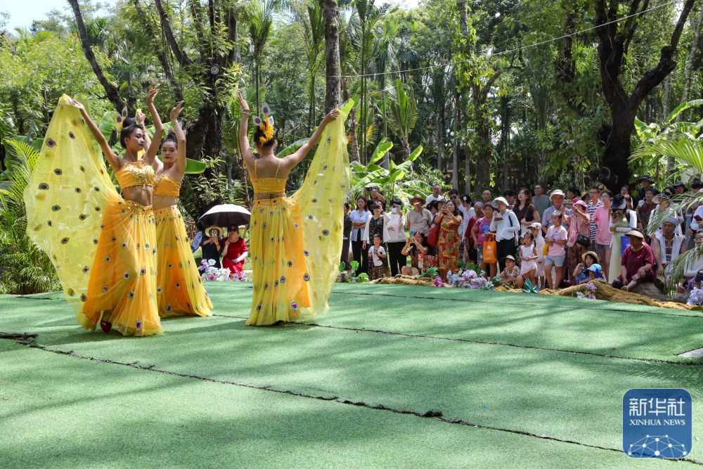 在云南省西雙版納傣族園景區(qū)內(nèi)的傳統(tǒng)傣寨曼聽(tīng)村,游客觀看戶外孔雀舞表演(7月7日攝)。新華社發(fā)(李云生 攝)