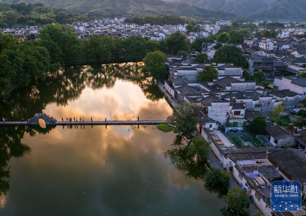 7月7日,游客在安徽省黃山市黟縣宏村游玩(無(wú)人機(jī)照片)。新華社記者 杜宇 攝