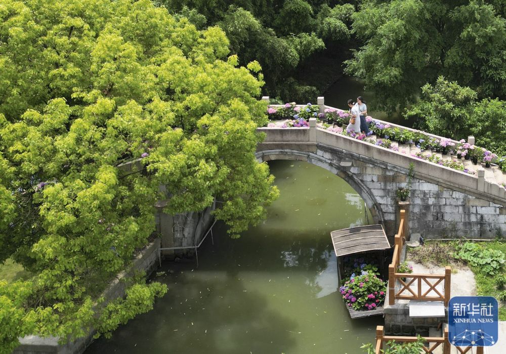 在上海東厙村,人們走過(guò)繡球花裝點(diǎn)的始建于明代的瑞龍橋(6月4日攝,無(wú)人機(jī)照片)。 新華社記者 劉穎 攝