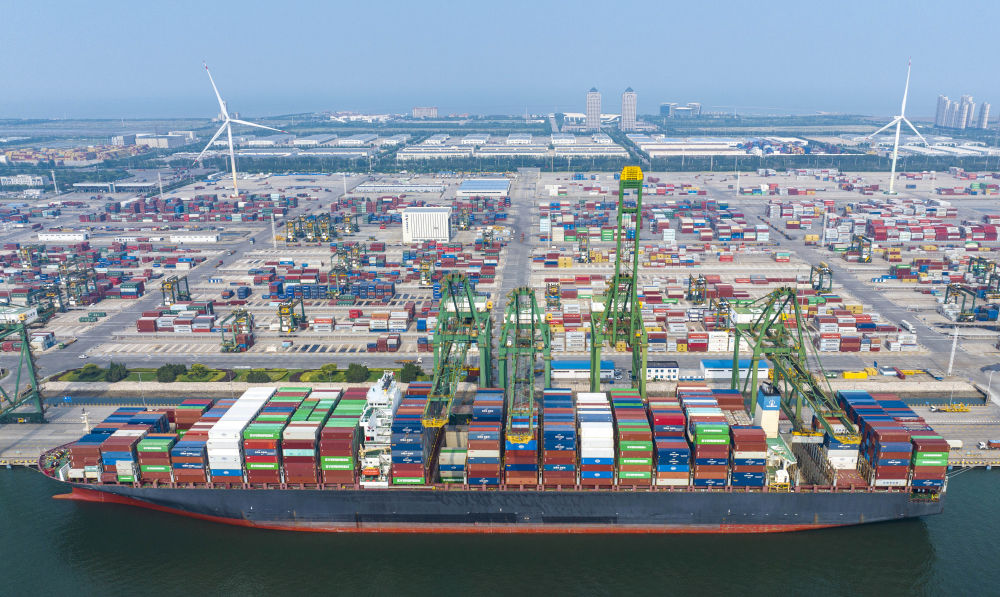 7月3日,一艘集裝箱貨輪??吭谔旖蚋厶窖髧?guó)際集裝箱碼頭(無人機(jī)照片)。新華社記者 趙子碩 攝