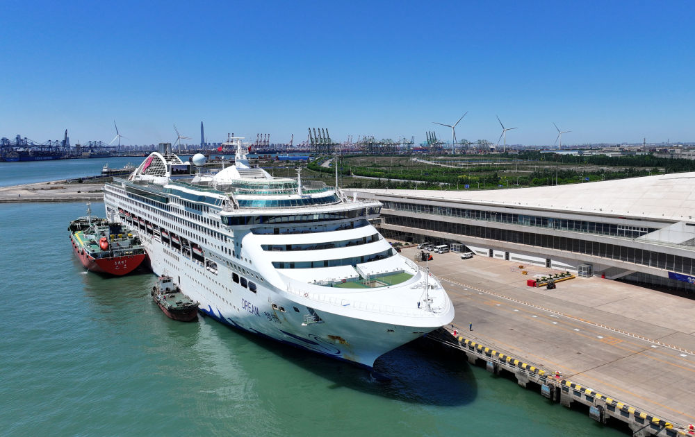 5月15日,“夢(mèng)想”號(hào)郵輪??吭谔旖驀?guó)際郵輪母港(無人機(jī)照片)。新華社記者 趙子碩 攝