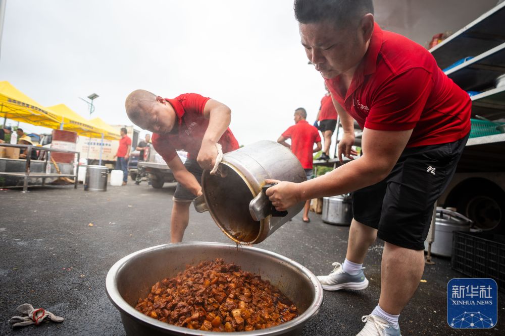7月10日,在岳陽市良心堡鎮(zhèn)望君洲村,志愿者在炒制菜肴。新華社記者 陳思汗 攝