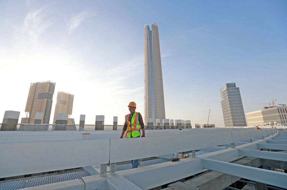 這是2023年11月22日在埃及開羅以東的埃及新行政首都中央商務(wù)區(qū)拍攝的一名在高樓樓頂施工的中國工人。新華社記者隋先凱攝