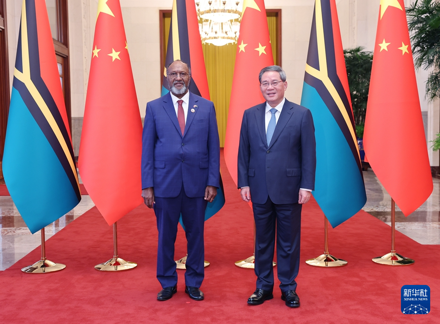 國務院總理李強12日上午在北京人民大會堂同來華進行正式訪問的瓦努阿圖總理薩爾維舉行會談。