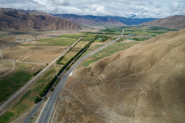 俯瞰西藏拉薩市至日喀則市區(qū)間的交通網(wǎng)絡(luò),從左至右依次為農(nóng)村公路、鐵路、國道和高等級公路(2024年6月27日攝,無人機照片)。