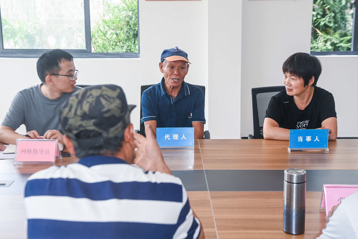 2023年7月26日,在浙江省諸暨市東白湖鎮(zhèn)婁東村新時代文明實(shí)踐站的文明共富會客廳內(nèi),網(wǎng)格長召集村里矛盾雙方當(dāng)事人以及黨員代表、鄉(xiāng)賢代表、人大代表等成員進(jìn)行宅基地指標(biāo)糾紛的現(xiàn)場調(diào)解。新華社記者 徐昱 攝