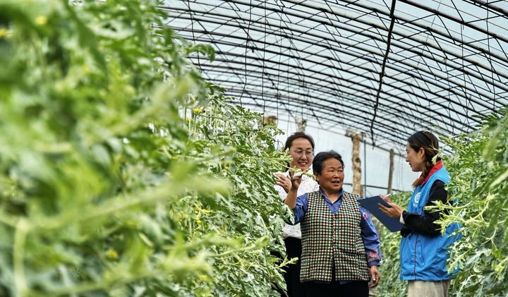 2024年4月9日,北京市大興區(qū)龐各莊鎮(zhèn)李家巷村政務(wù)服務(wù)站的工作人員來到大棚內(nèi)為瓜農(nóng)辦理社保業(yè)務(wù)。新華社記者 李欣 攝
