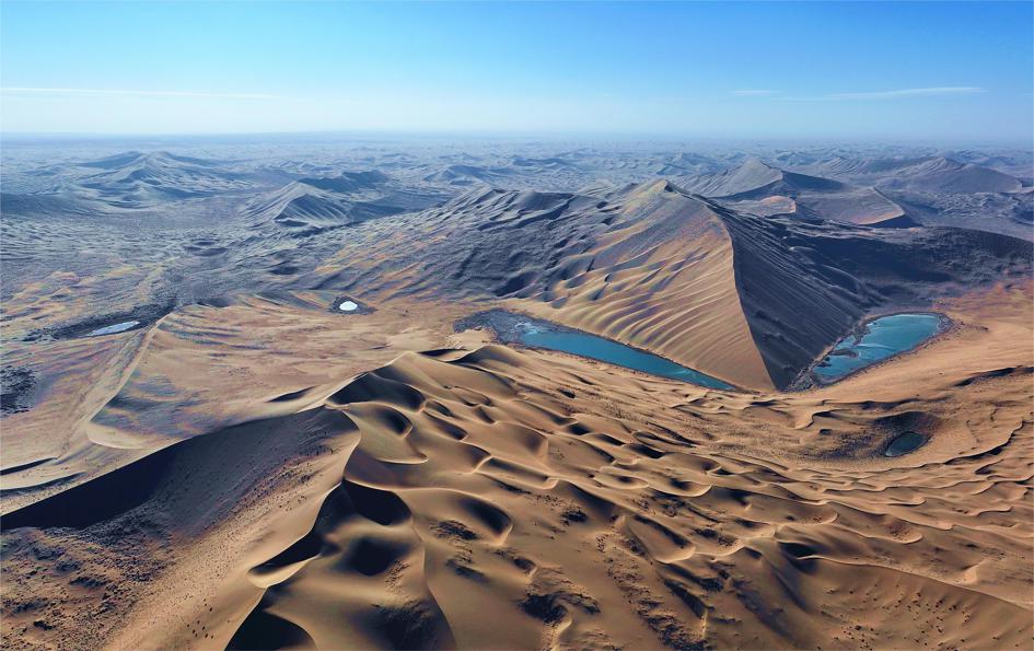 巴丹吉林沙漠地處阿拉善高原,屬中國(guó)西北極干旱的溫帶荒漠地區(qū),是中國(guó)第三大沙漠和第二大流動(dòng)沙漠。該地區(qū)以連綿起伏的高大沙山和丘間眾多湖泊而聞名,展示了沙漠景觀不斷變換的地質(zhì)和地貌特征,令人嘆為觀止,全球少有沙漠可以比肩。巴丹吉林沙漠的重要標(biāo)志包括世界最高的固定沙山(相對(duì)高度達(dá) 460 米)、最密集的沙漠湖泊、最廣闊的鳴沙區(qū)域,以及多樣的風(fēng)蝕地貌。如此獨(dú)特的景觀展現(xiàn)了巴丹吉林沙漠非凡的自然美學(xué)價(jià)值,展示著地球上重要、典型且持續(xù)的風(fēng)沙地貌發(fā)展過程,同時(shí)也是豐富多彩的生物棲息地。