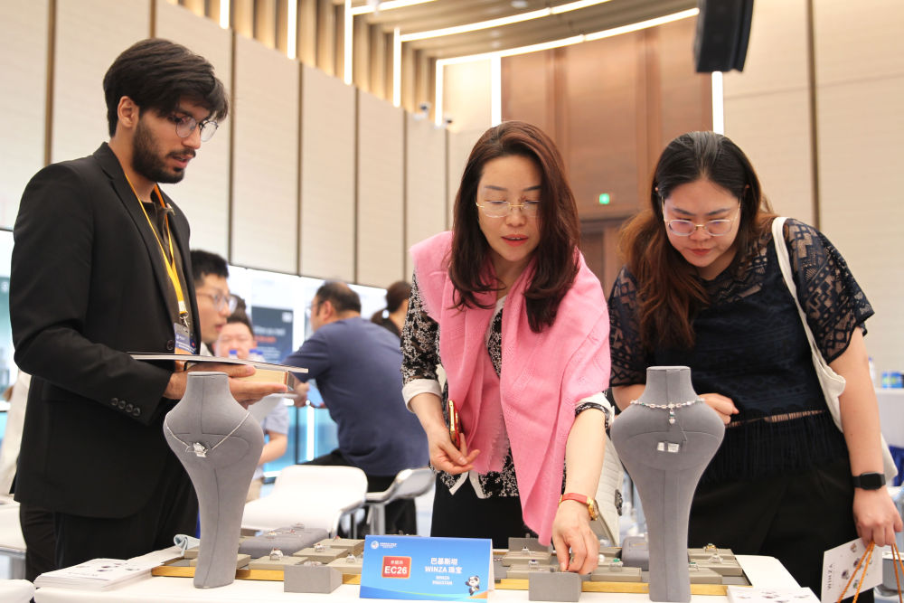 2024年7月9日,一名外國(guó)參展企業(yè)工作人員(左)向采購(gòu)商介紹企業(yè)產(chǎn)品。(陳浩明 攝)