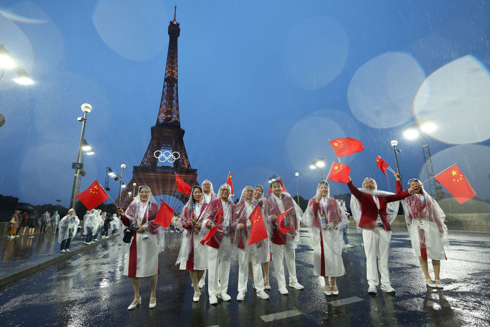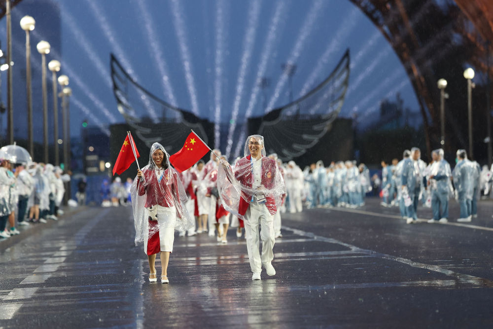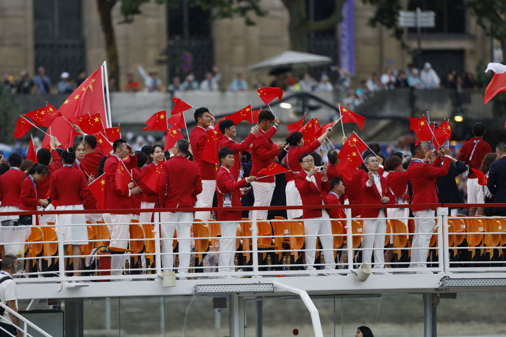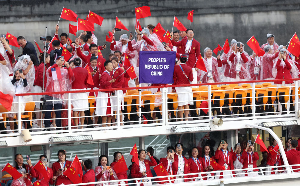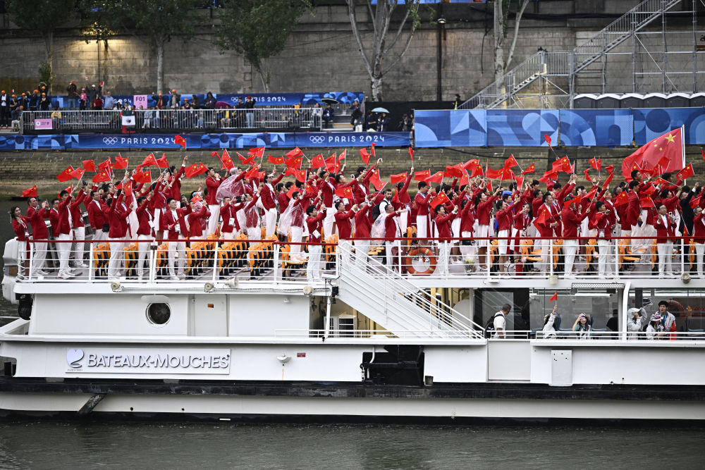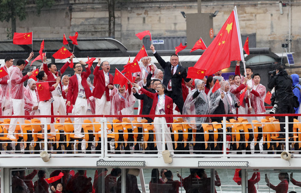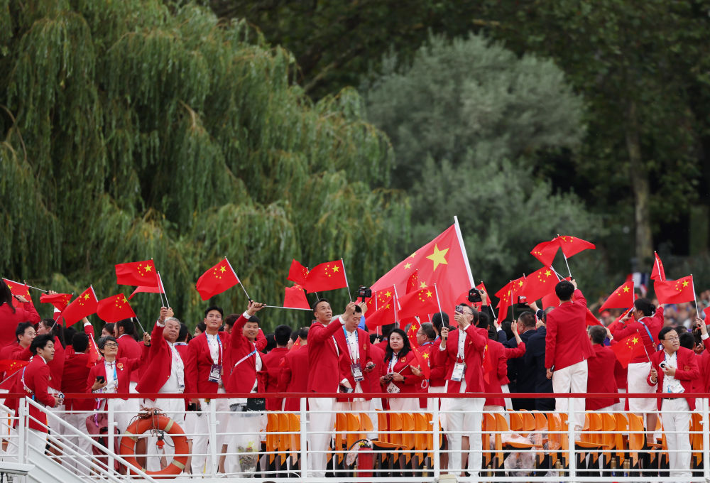 當(dāng)?shù)貢r間7月26日,第33屆夏季奧林匹克運動會開幕式在法國巴黎舉行。乒乓球運動員馬龍、花樣游泳運動員馮雨高擎五星紅旗,中國體育代表團運動員乘船在塞納河巡游。