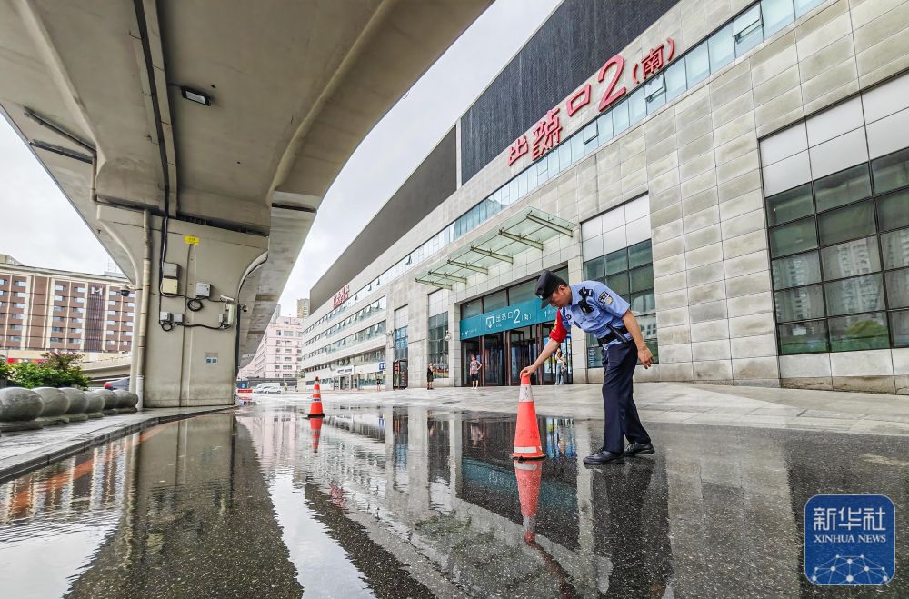 7月28日,在沈陽北站,沈陽鐵路公安處民警在出站口附近的積水處設(shè)立警示標志?! ⌒氯A社發(fā)
