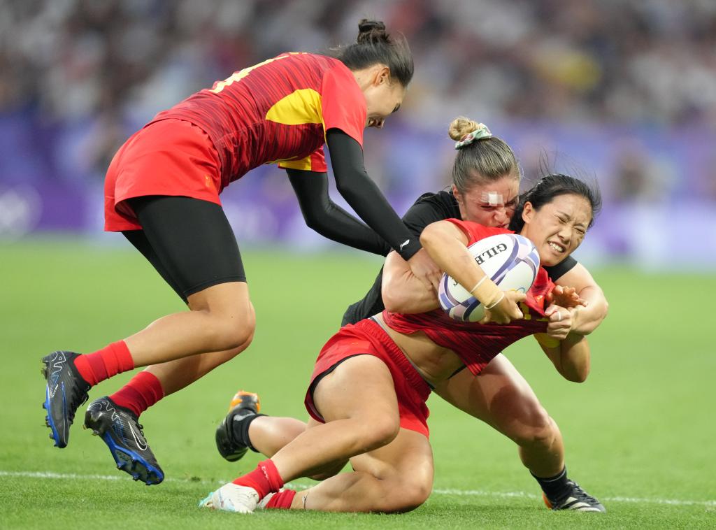7月29日,中國隊球員劉瀟倩(左)與加拿大隊球員夏麗蒂·威廉姆斯在比賽中。當(dāng)日,在巴黎奧運會七人制橄欖球女子分組循環(huán)賽A組比賽中,中國隊17比26不敵加拿大隊。 新華社記者 呂小煒 攝