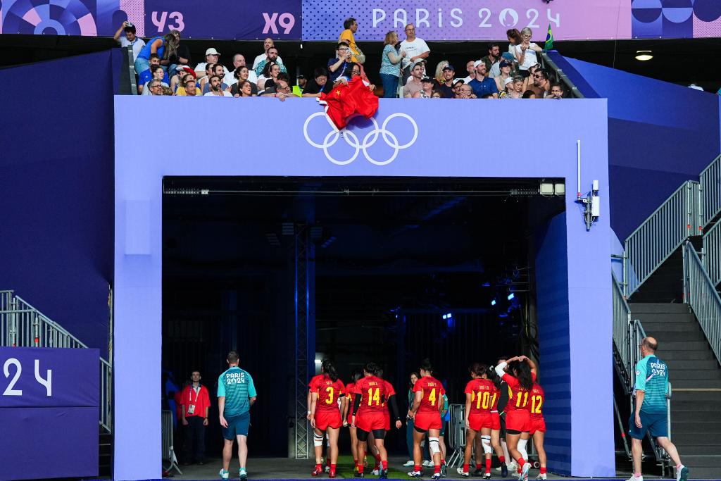7月29日,中國隊選手劉瀟倩(右三)在賽后退場時向觀眾“比心”。當(dāng)日,在巴黎奧運會七人制橄欖球女子四分之一決賽中,中國隊5比55不敵新西蘭隊。 新華社記者 許暢 攝
