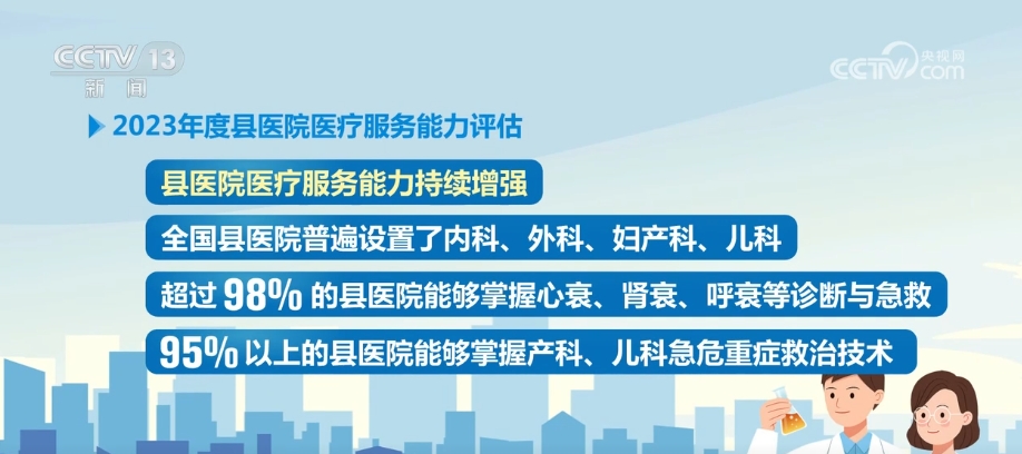 評(píng)估顯示,縣醫(yī)院醫(yī)療服務(wù)能力持續(xù)增強(qiáng)。全國(guó)縣醫(yī)院普遍設(shè)置了內(nèi)科、外科、婦產(chǎn)科、兒科。超過98%的縣醫(yī)院能夠掌握心衰、腎衰、呼衰等診斷與急救;95%以上的縣醫(yī)院能夠掌握產(chǎn)科、兒科急危重癥救治技術(shù);超過88%的縣醫(yī)院能夠進(jìn)行多發(fā)性創(chuàng)傷的診斷與處理。平均每家縣醫(yī)院診療人次為37.01萬,與2022年度基本持平。床位使用率達(dá)到87.66%,較2022年度提高了7.07個(gè)百分點(diǎn);平均住院日7.59天。