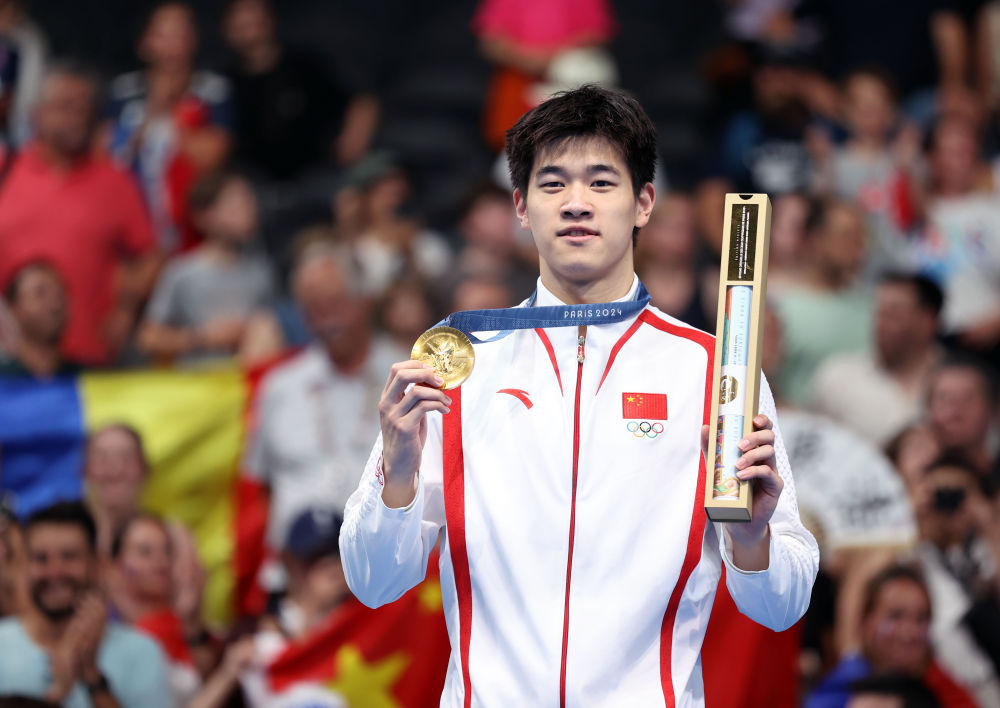 ↑中國(guó)選手潘展樂(lè)在頒獎(jiǎng)儀式上。新華社記者 雒圓 攝