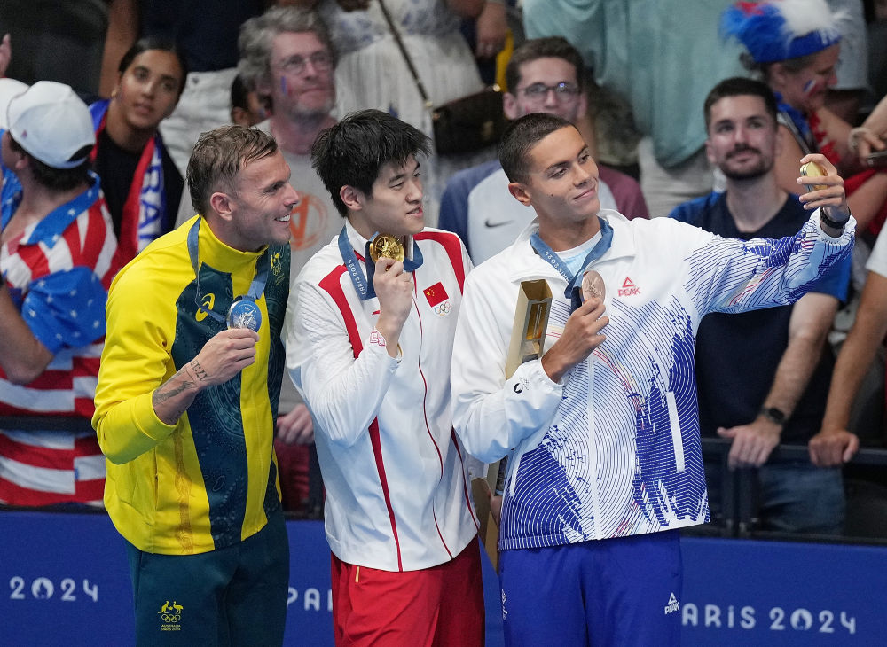 ↑冠軍中國(guó)選手潘展樂(lè)(中)、亞軍澳大利亞選手查默斯(左)與季軍羅馬尼亞選手波波維奇在頒獎(jiǎng)儀式后。新華社記者 雒圓 攝