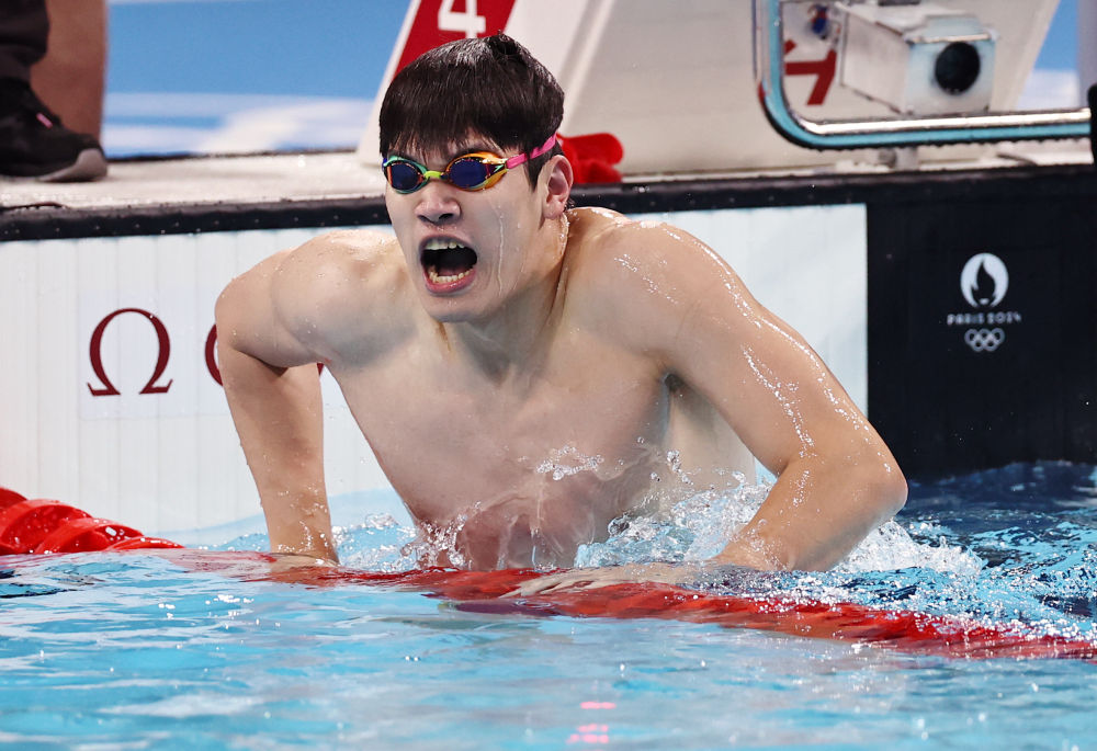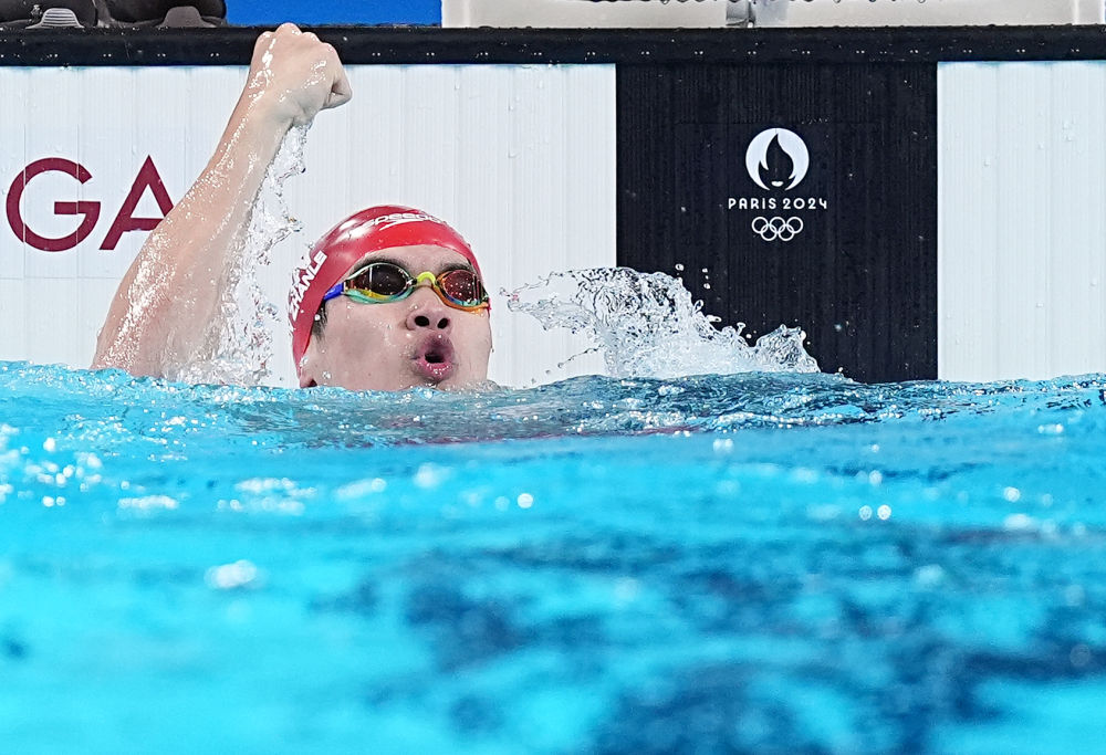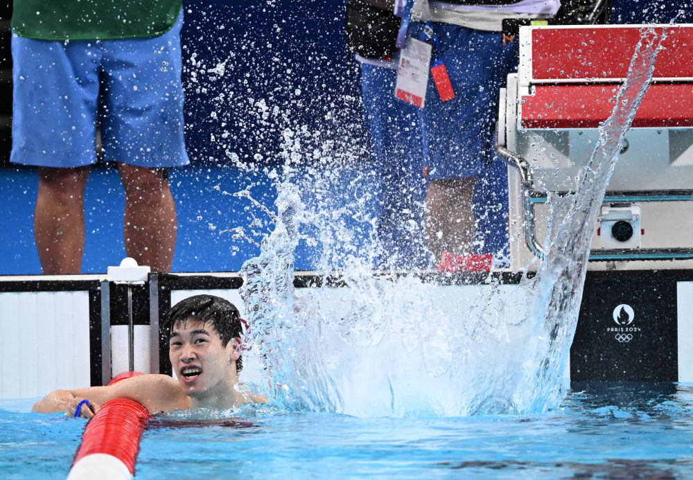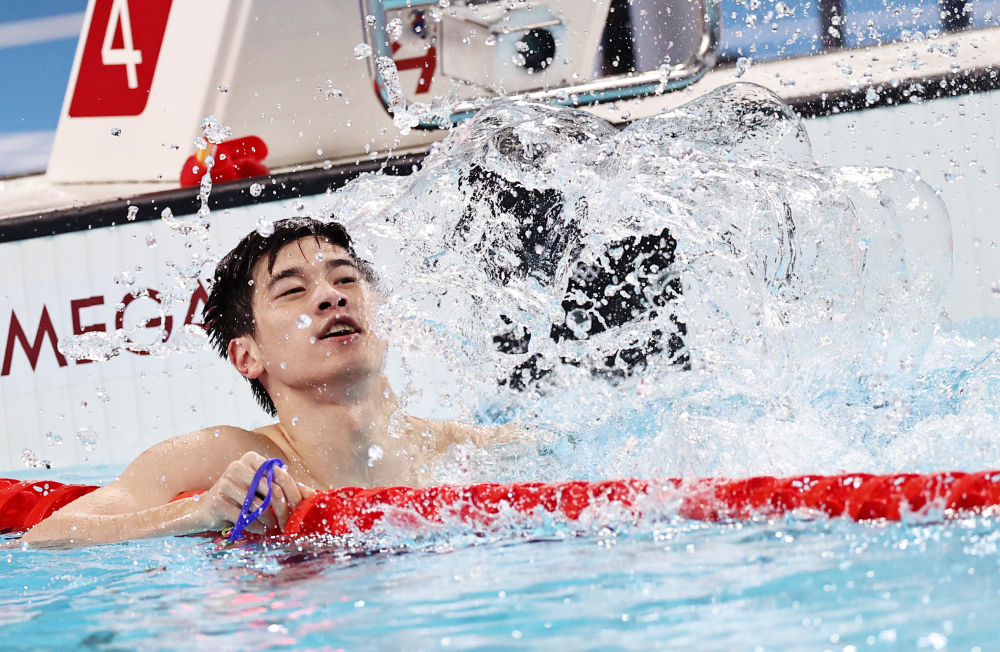 ↑中國(guó)選手潘展樂(lè)在比賽后慶祝。