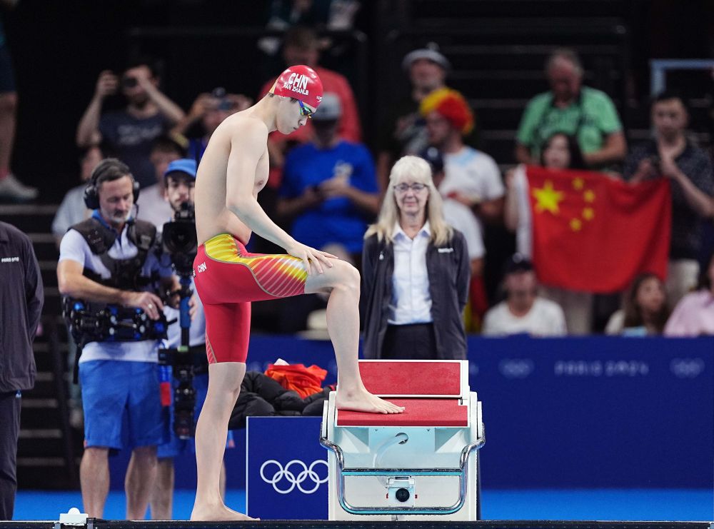 ↑中國(guó)選手潘展樂(lè)在比賽前。