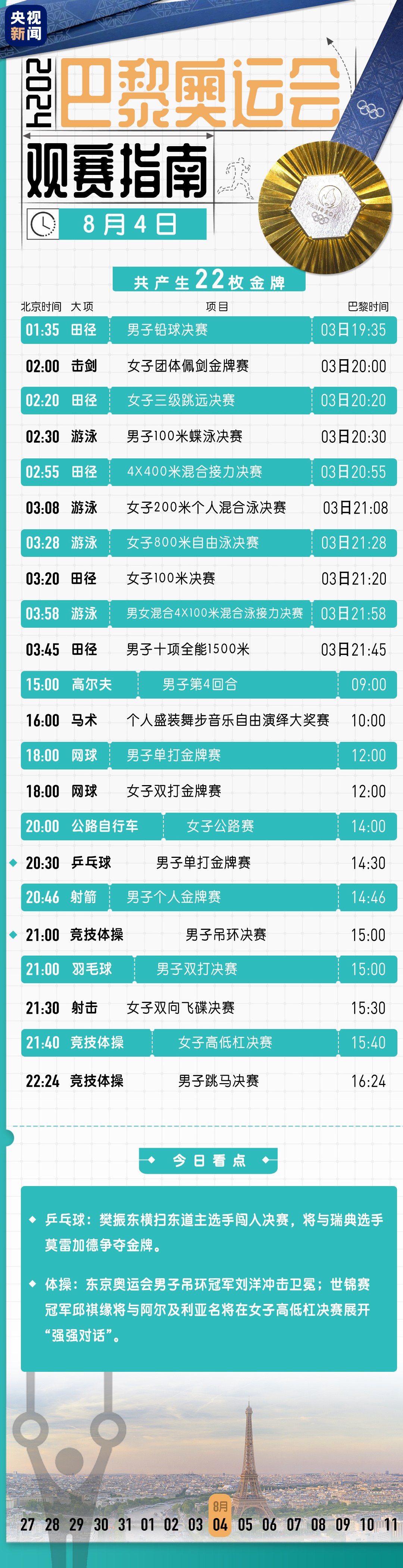 巴黎奧運(yùn)會第九個比賽日將產(chǎn)生20枚金牌。中國體育代表團(tuán)將在乒乓球、羽毛球等項(xiàng)目上沖擊金牌。
