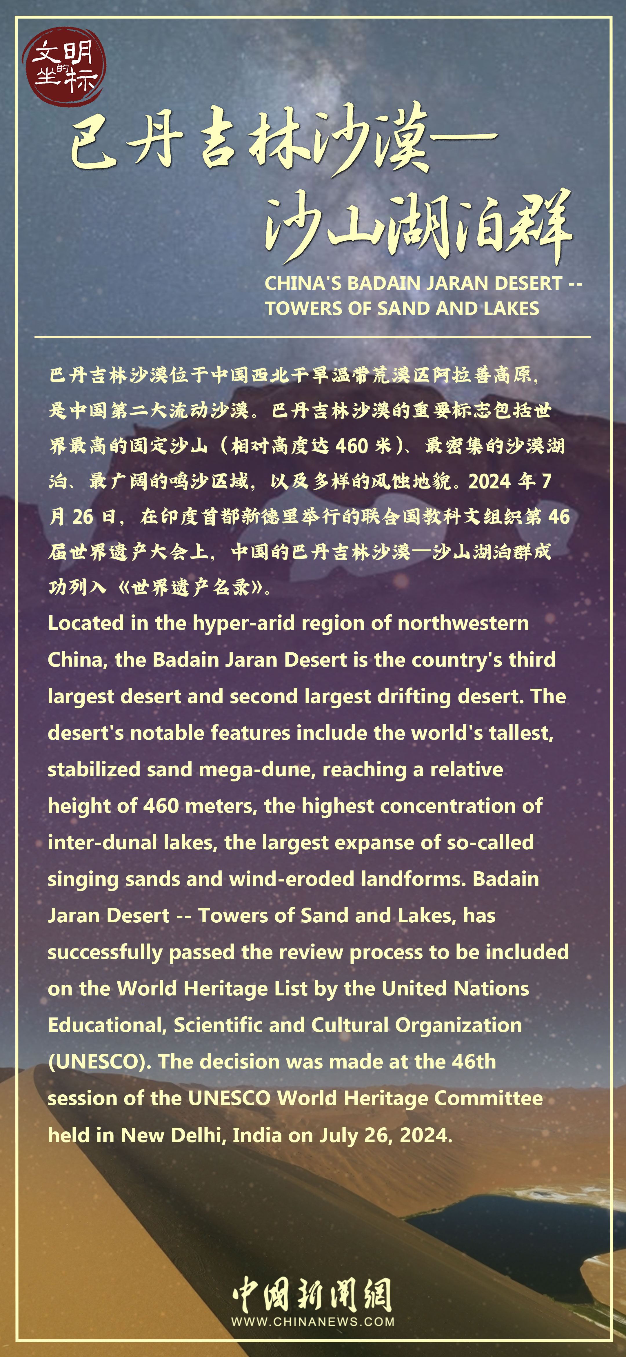 巴丹吉林沙漠位于中國內(nèi)蒙古自治區(qū)阿拉善盟阿拉善右旗北部,以奇峰、鳴沙、湖泊、神泉、古廟“五絕”著稱,被譽為“中國最美沙漠”。神奇的是,在年降水量不足40毫米的巴丹吉林沙漠,竟有100多個湖泊。這些湖水從哪里來?為何從不干涸?來巴丹吉林沙漠,放空心靈,感受大自然的浩瀚與壯美。