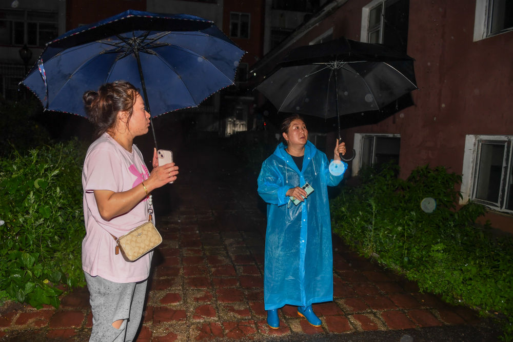 7月29日,在吉林省臨江市,建國(guó)街道臺(tái)興社區(qū)黨委書記孫愛(ài)武(右)和同事在怡景花園小區(qū)排查人員安置情況。新華社記者 張楠 攝